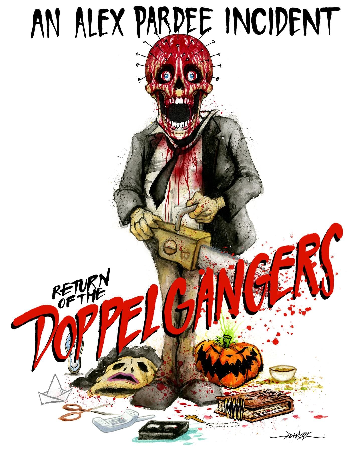 Alex Pardee is back, bringing all-new nightmare fuel to his latest solo show! Ten years ago, he unleashed DOPPELGÄNGERS – 150 creepy, watercolor portraits inspired by decades of classic horror movies and monster madness. The book had 3 printings, but it’s been sold out and out of print for years…until now.